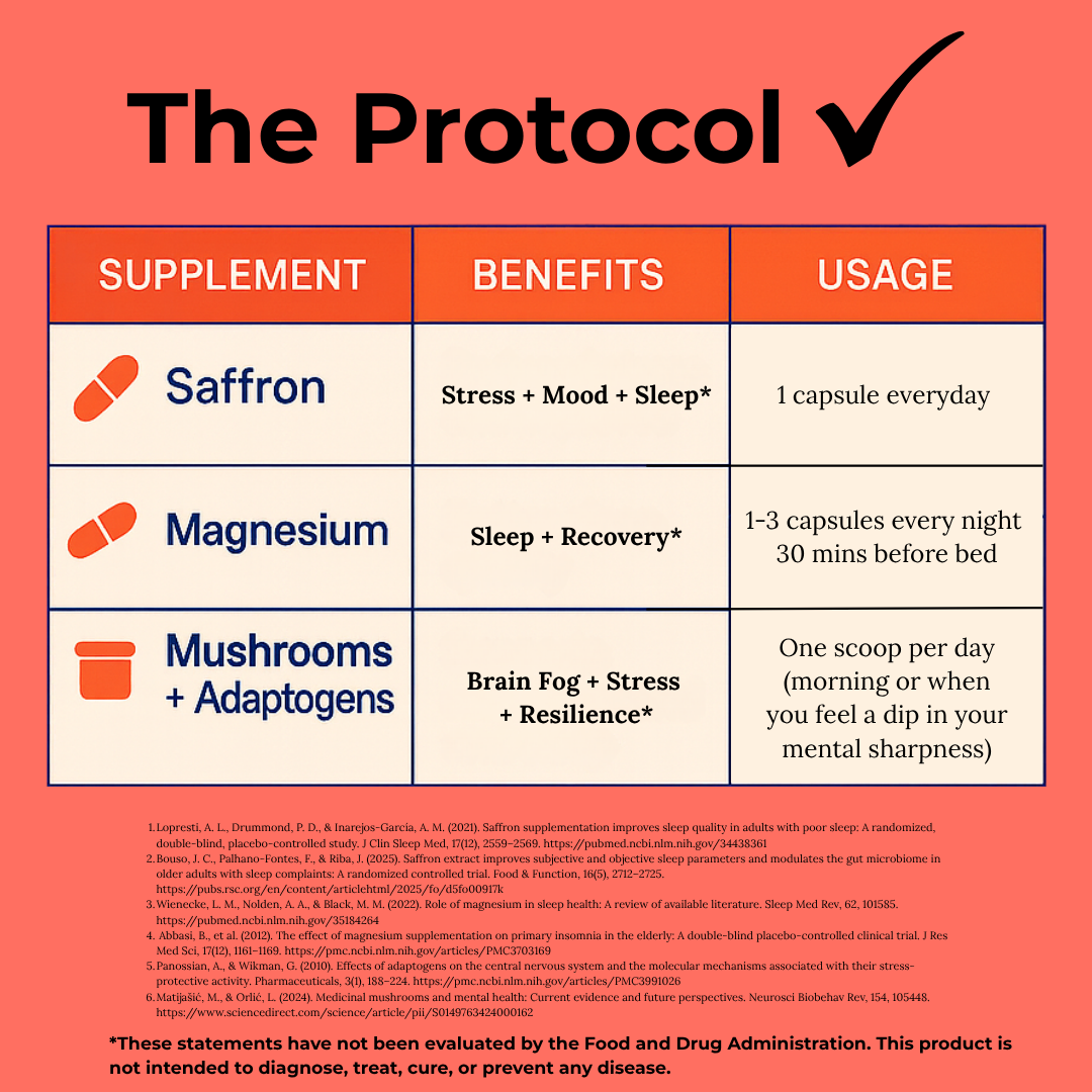 - Daily: Saffron — 1 cap with a meal (AM or PM). Switch to before bedtime with Magnesium Glycinate if drowsiness occurs with morning dose.